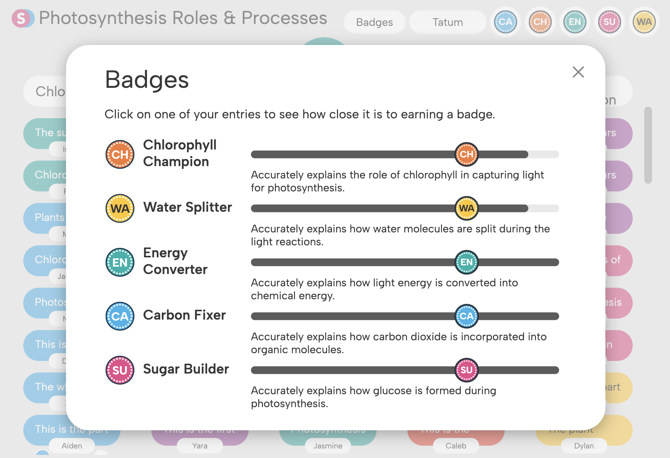 Content Knowledge Badges focus on the essential processes within a particular scientific concept. In a lesson on photosynthesis, badges guide students to explain how chlorophyll captures energy, how water splitting and carbon fixation occur, and how these processes ultimately lead to sugar formation.