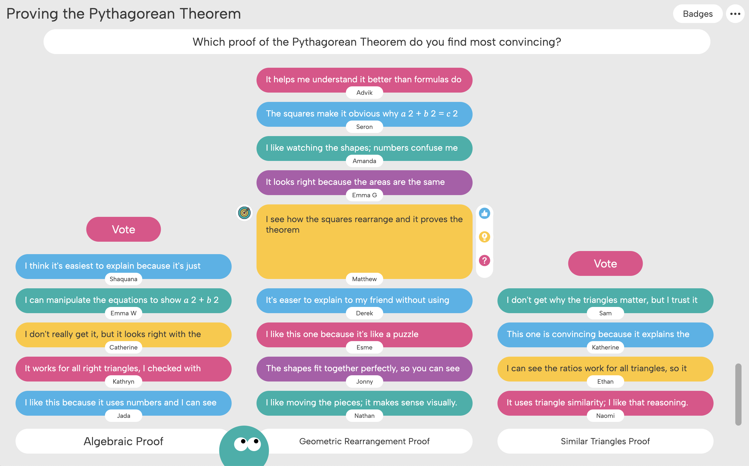 In this Poll structure, students vote on which Pythagorean proof clicks for them, and which leaves questions unanswered. Seeing classmates’ votes and perspectives helps them notice gaps in their own understanding and rethink their logic. Suddenly proofs aren’t just memorized—they’re questioned, compared, and defended in real time. Use this Structure in your classroom!