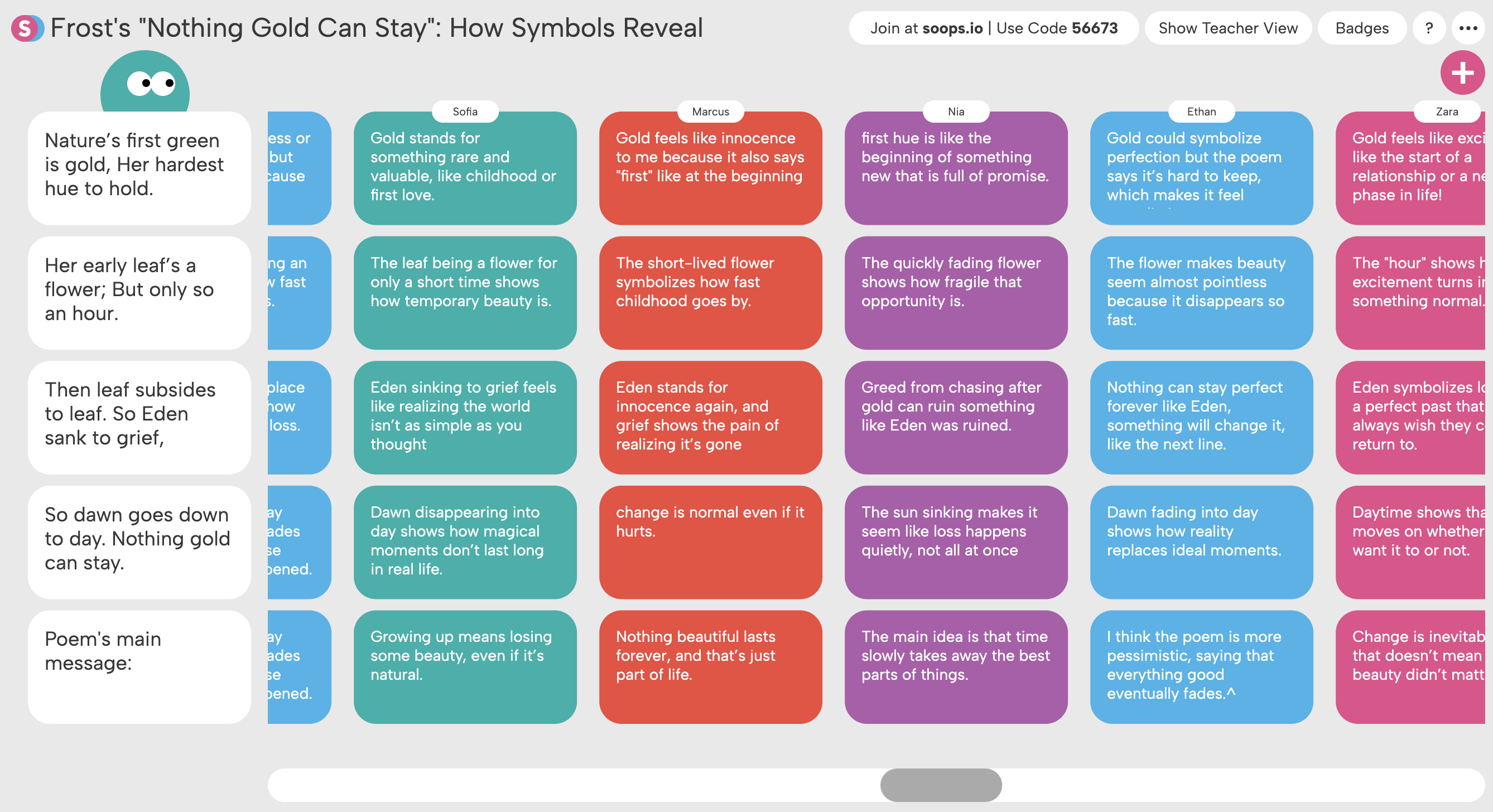 Line by line, students work through Robert Frost’s poem "Nothing Gold Can Stay" in a Sequence structure, analyzing how symbols reference and build on each other to create the poem’s overall meaning. As they progress, they see classmates’ interpretations, noting similarities, differences, and new insights. Use this structure in your classroom!