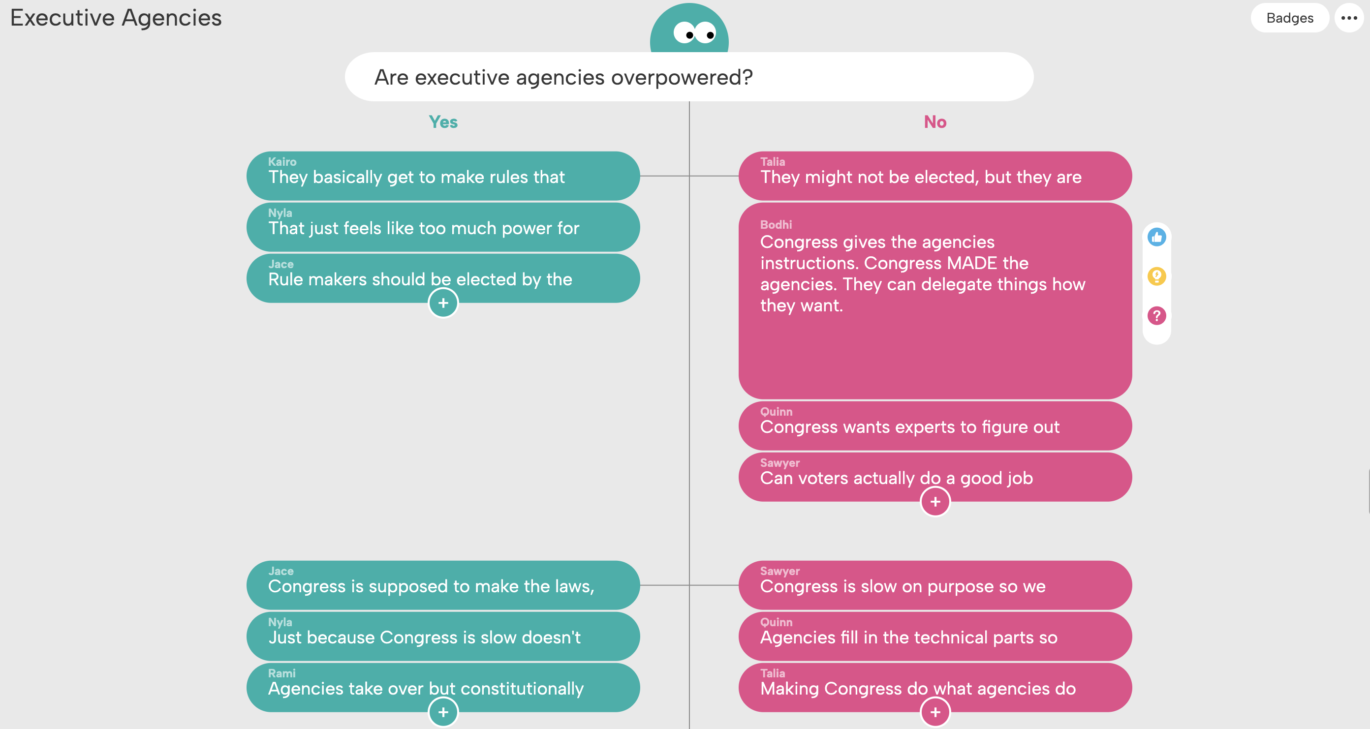 Note Board is a structured space for collaborative knowledge-building, where every student contributes what they know about executive departments, their agencies, and the powers they hold. By capturing individual ideas in one shared panel, students broaden their understanding of how the executive branch operates. Use this structure in your classroom!